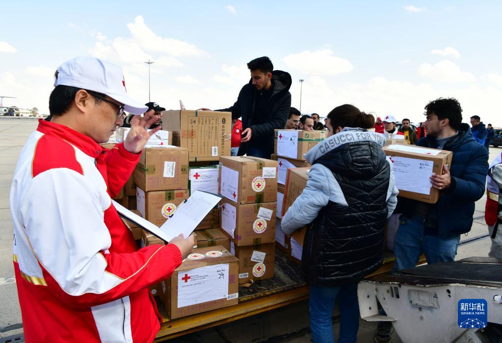 2月13日,工作人員在敘利亞大馬士革國際機場卸載中國紅十字會援助的人道主義物資。