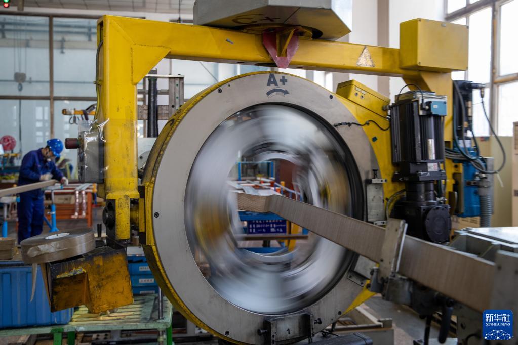 這是2月13日在哈電集團哈爾濱電機廠有限責任公司生產車間內拍攝的正在運行的定子線棒自動包扎設備。新華社記者 張濤 攝