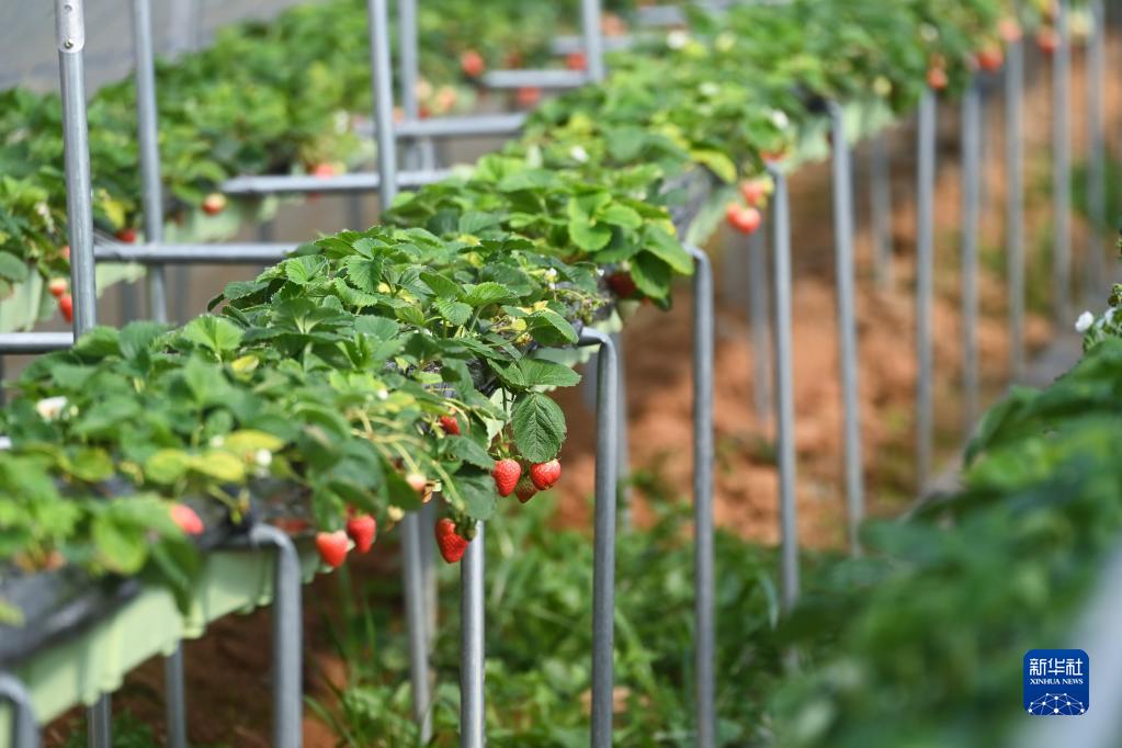 2月14日拍攝的杭州市臨安區板橋鎮草莓種植基地內立體栽培的有機草莓。