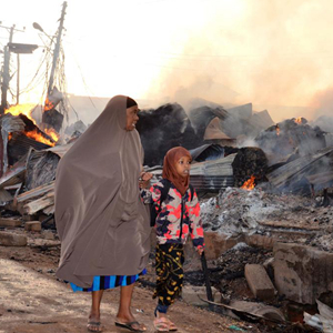 2月13日,在烏干達首都坎帕拉近郊的基塞尼,人們走過一處燃燒的廢墟。