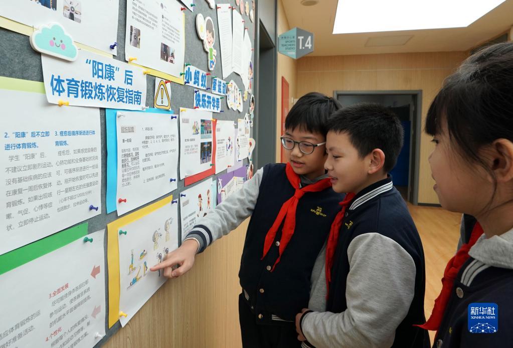 2月13日,在上海市長寧區天山第一小學,返校學生在走廊閱讀新學期體育鍛煉指南。