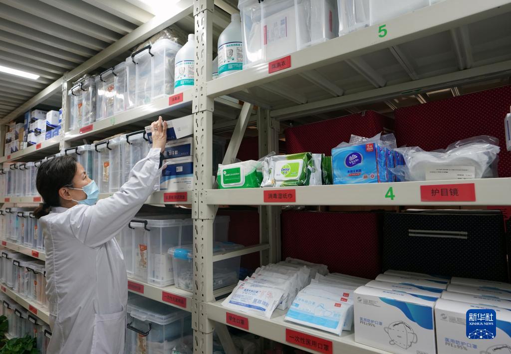 2月13日,上海市長寧區天山第一小學的衛生老師在倉庫內整理防疫用品。