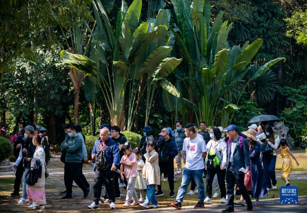 2月12日,游客在位于西雙版納州勐臘縣勐侖鎮的中國科學院西雙版納熱帶植物園內游覽。