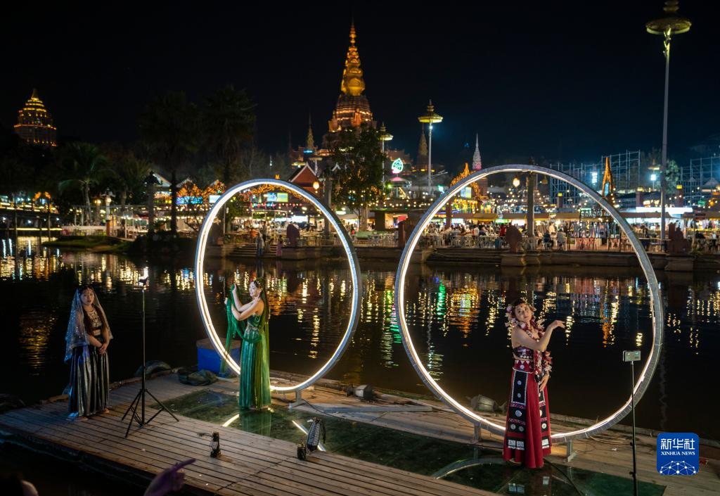 2月13日,游客在西雙版納州景洪市告莊西雙景星光夜市旅拍。