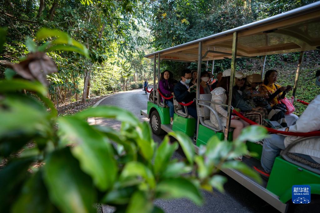 2月12日,游客在位于西雙版納州勐臘縣勐侖鎮的中國科學院西雙版納熱帶植物園內乘坐擺渡車游覽。