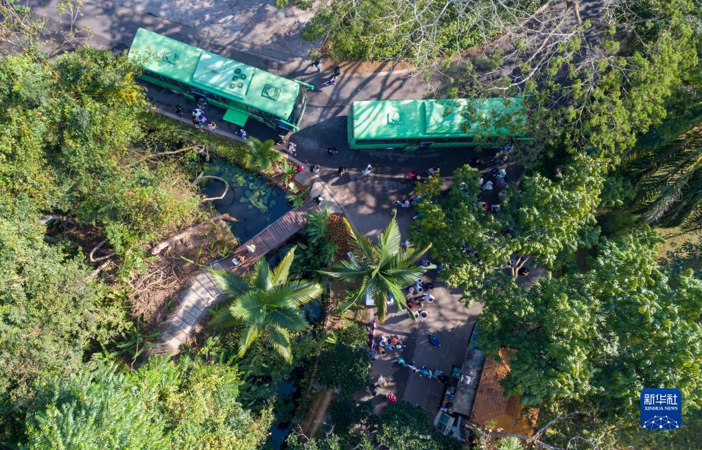 2月12日,游客乘坐旅游大巴抵達位于西雙版納州勐臘縣勐侖鎮的中國科學院西雙版納熱帶植物園(無人機照片)。