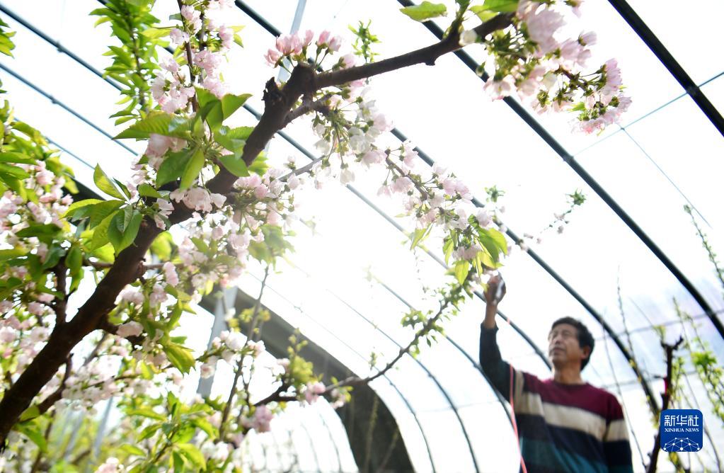 2月14日,石家莊市贊皇縣黃家溝櫻桃種植基地,果農進行人工授粉。