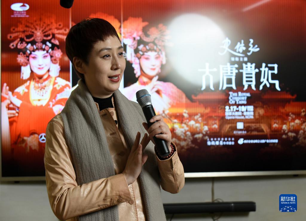 2月14日,京劇演員史依弘在媒體見面會上演唱《大唐貴妃》中的唱段。