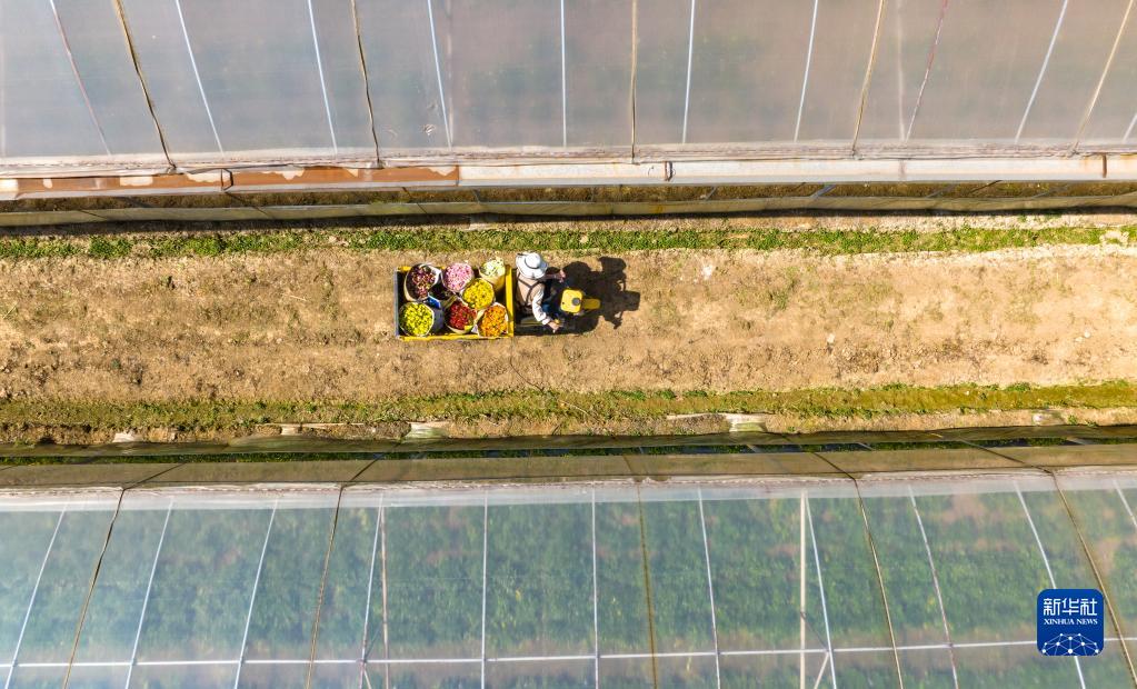主播畢茜茜拉著自家采摘的鮮花準備進行分揀包裝(無人機照片,2月12日攝)。