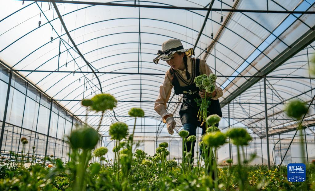 主播畢茜茜在采摘鮮花(2月12日攝)。