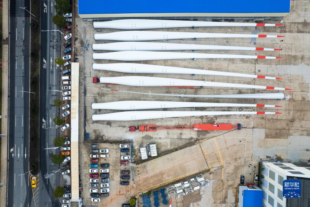 這是2月14日在株洲市淥口經開區灣塘工業園株洲時代新材料科技股份有限公司光明分公司拍攝的風電葉片(無人機照片)。