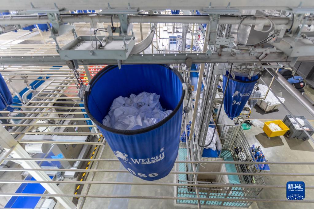 2月14日,在華鐵旅服上鐵勤佳洗滌廠,裝滿待清洗臥具的布草吊袋按照自動化洗衣系統指示運轉。