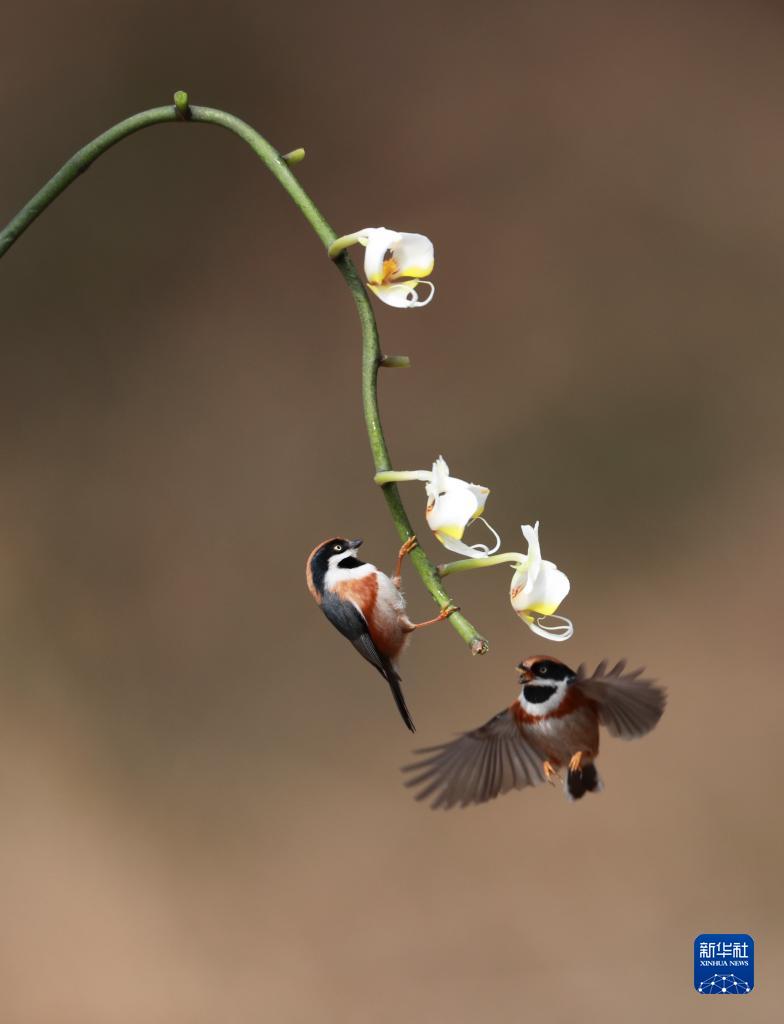 近日,江蘇鎮江西山水庫附近山花開放,吸引紅頭長尾山雀前來覓食小憩。