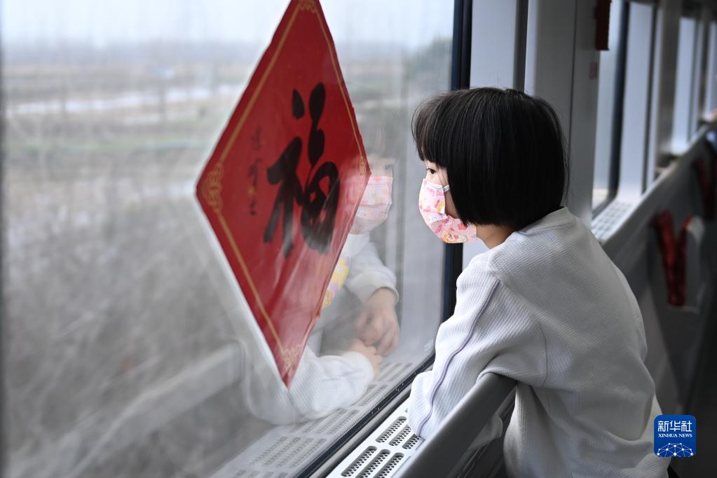 準備跟媽媽、弟弟一起回重慶外婆家過年的貝貝在從杭州東站發往重慶北站的列車窗邊觀看沿途的風景(1月18日攝)。貝貝目前上小學二年級,已經三年沒有回外婆家過年了,今年爸爸要在春節期間值班,因此沒有一起登車返回。