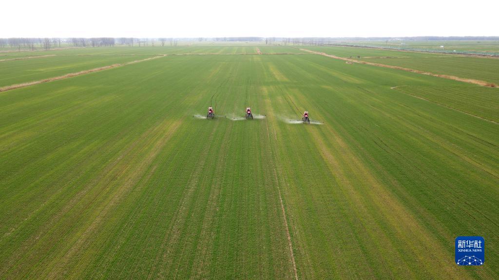 近日,安徽省蚌埠市五河縣頭鋪鎮村民搶抓農時進行小麥春管作業,田間地頭一派農忙景象。