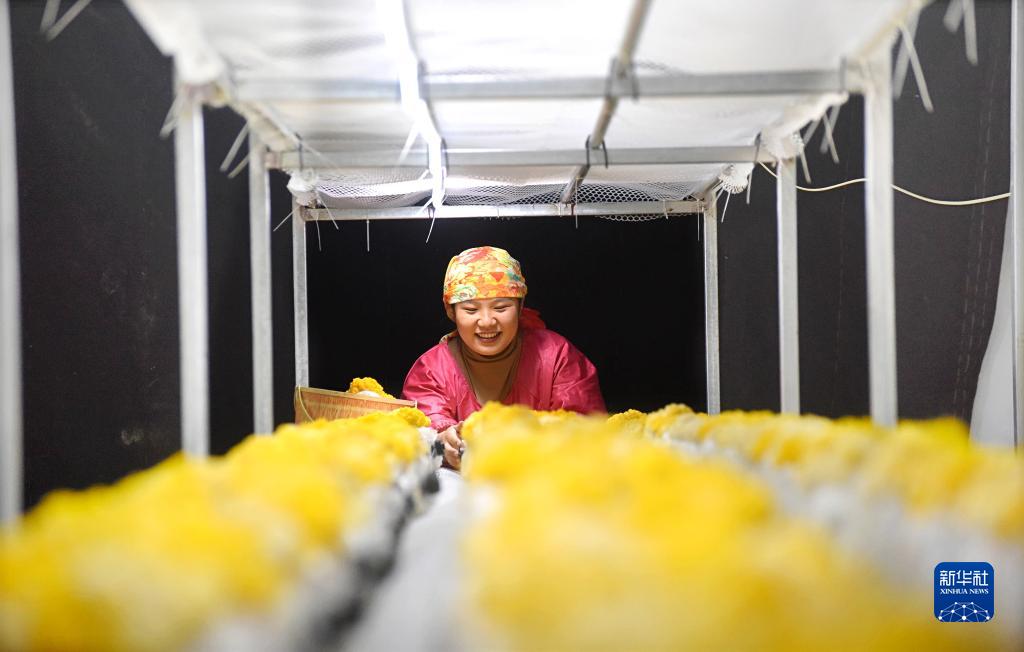 2月14日,在山東省淄博市沂源縣中莊鎮桃峪村一菌業種植園區,“產業工人”在種植大棚里進行管護。