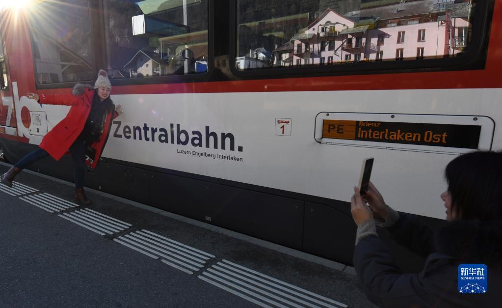 2月14日,中國游客在瑞士盧塞恩開往因特拉肯地區的金色山口列車旁拍照留念。