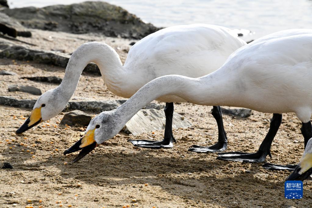 大天鵝在榮成市崖頭街道櫻花湖一食物投放點進食(2月15日攝)。