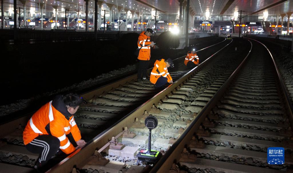 2月15日凌晨,中國鐵路上海局集團有限公司南京橋工段的鐵路檢修人員在南京南站對線路進行檢測。