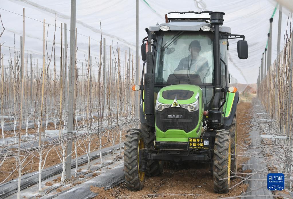 2月15日,工作人員在北京市峪口鎮西樊各莊村京瓦果業科技示范園駕駛農機設備耕地。
