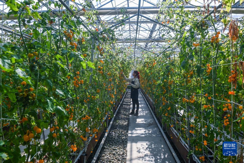 2月15日,在浙江省嘉興市南湖區鳳橋鎮一個有機農業園的大棚內,工作人員在采摘立體栽培的小番茄。該農業園配備數字化智慧農業系統,引進農業機器人進行施肥、澆水、翻耕、播種、植保等農事工作。