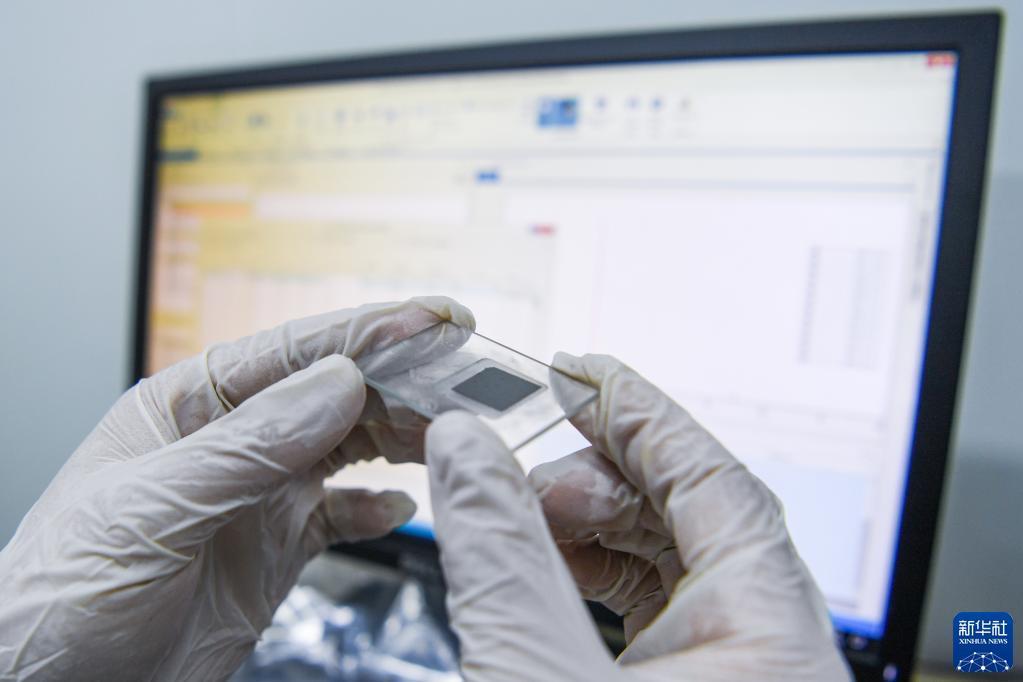 江蘇省先進碳材料分析測試中心的技術人員展示即將進行檢測的石墨烯導熱膜(2月14日攝)。
