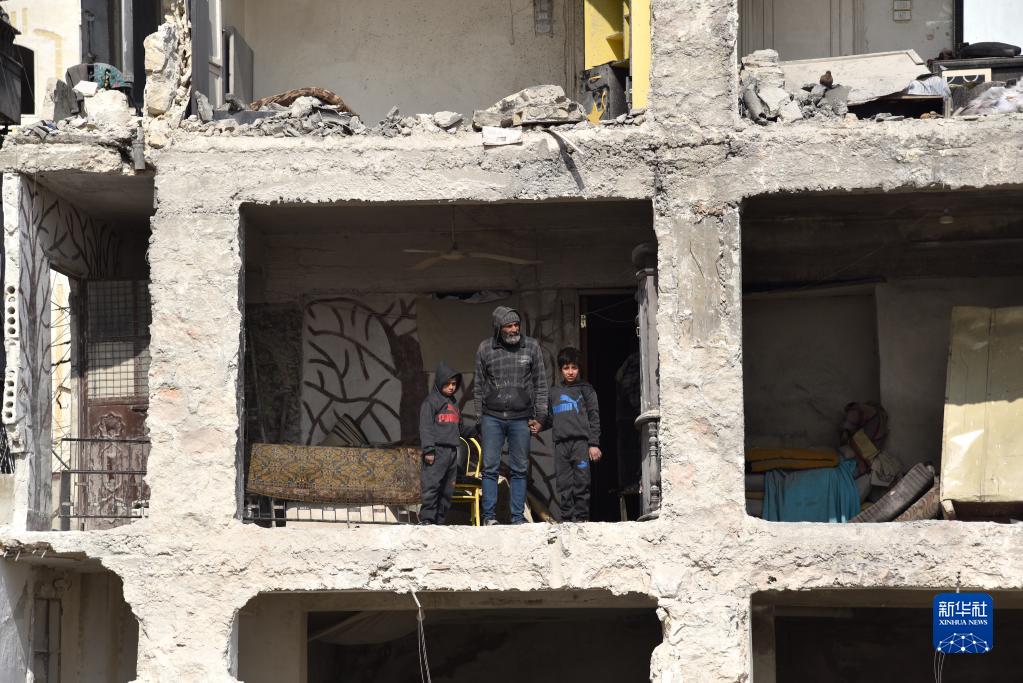 2月13日,在敘利亞地震災區阿勒頗,人們站在受損的建筑中向外張望。