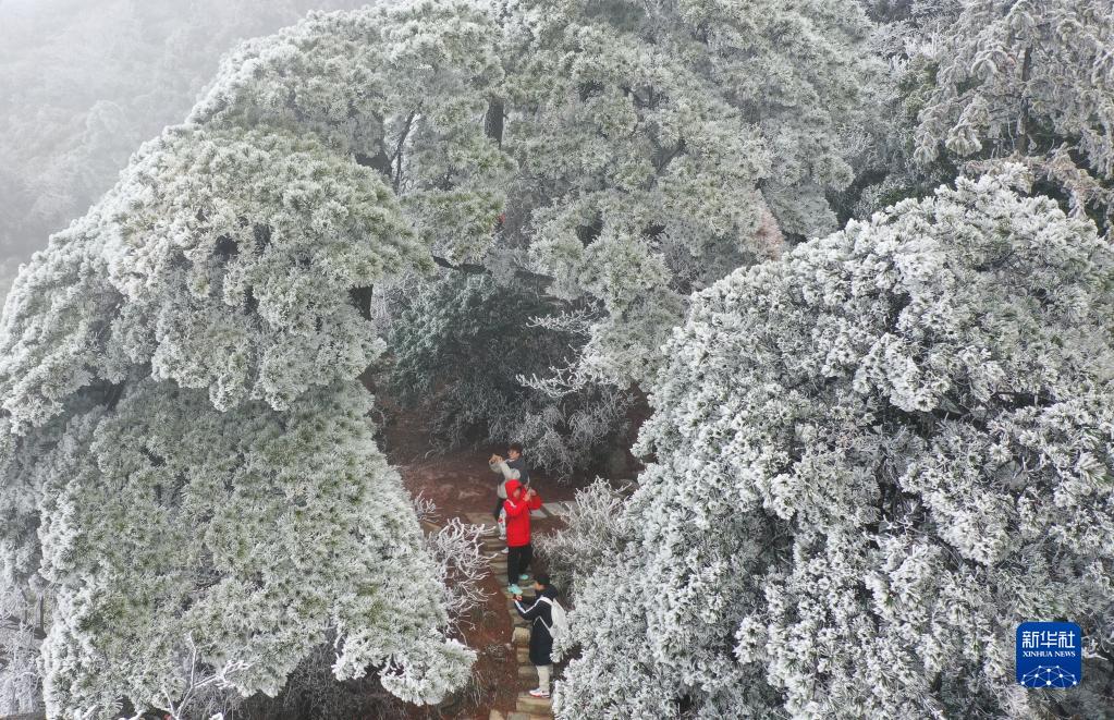 2月15日,游客在湖南省衡陽市南岳衡山風景區游玩賞雪(無人機照片)。