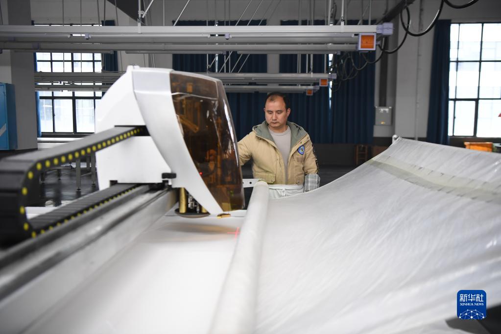 2月15日,工人在湖南尊睿服飾有限公司操作自動裁床,自動裁床可根據圖紙精準裁剪布料。
