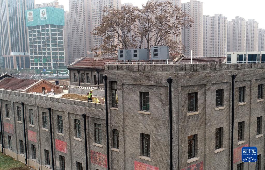 2月15日,工人對石家莊市新華區正太飯店進行改造升級(無人機照片)。