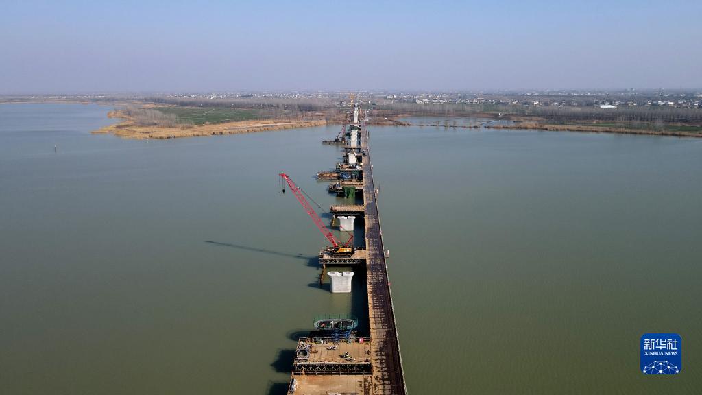 這是2月15日拍攝的合新鐵路安徽段懷洪新河特大橋跨沱湖水中墩施工現場(無人機照片)。