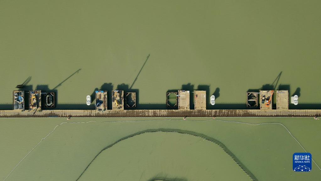 這是2月15日拍攝的合新鐵路安徽段懷洪新河特大橋跨沱湖水中墩施工現場(無人機照片)。