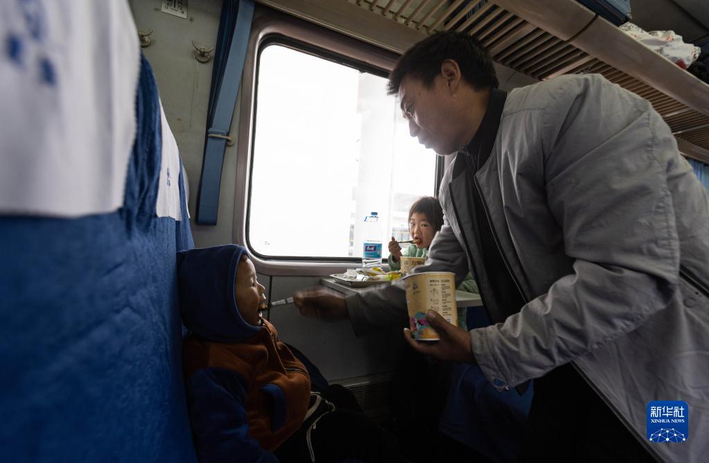 2月14日,在臨客K4618次列車上,一位父親照顧孩子吃飯 。