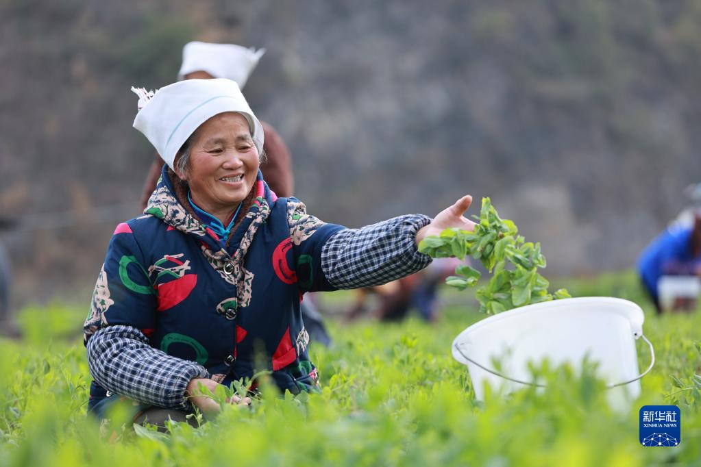 2月15日,在龍里縣灣灘河鎮郊外,菜農在采摘豌豆尖。