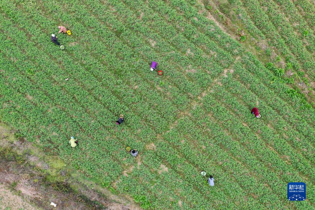 2月15日,在龍里縣灣灘河鎮郊外,菜農在采摘豌豆尖(無人機照片)。
