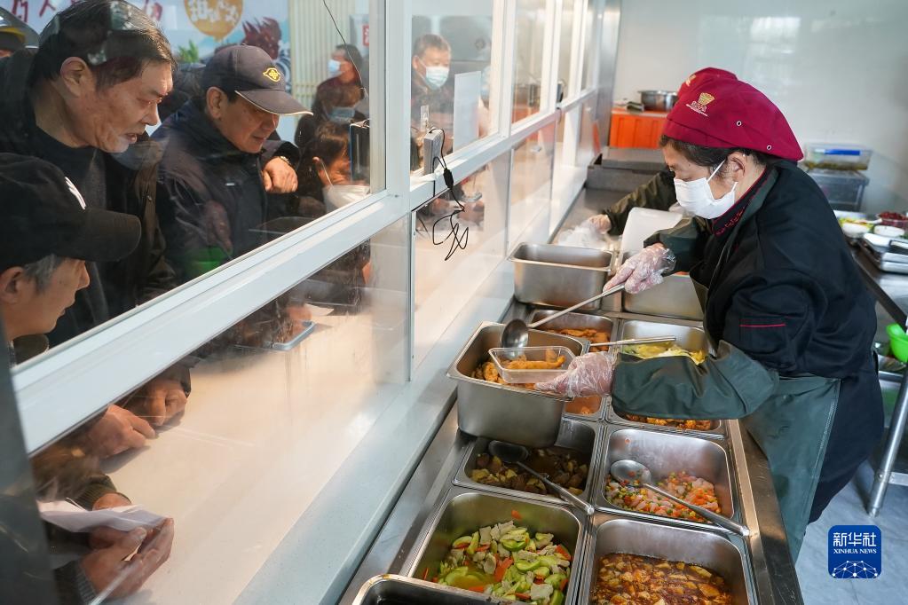 2月15日,鄰里紅餐廳服務員為居民打菜。