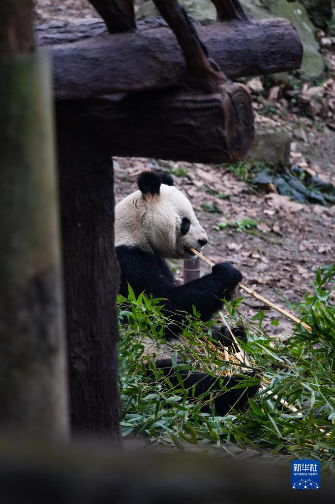 2月15日,在中國大熊貓保護研究中心都江堰基地,大熊貓在吃竹子。