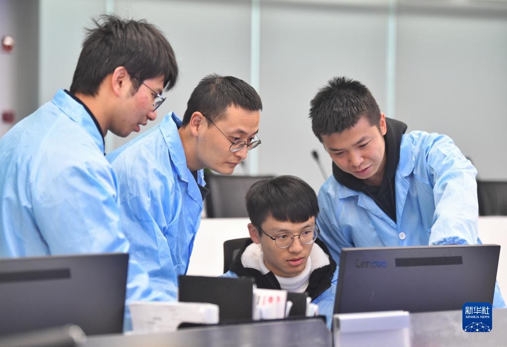 2月14日,國家超級計算成都中心科研人員在討論二氧化碳電催化還原反應路徑計算工作的程序優化方案。