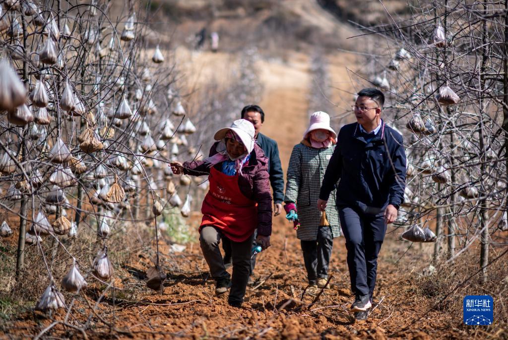 全國人大代表袁海波(右一)在云南省曲靖市馬龍區一種植基地與務工人員聊天(2月11日攝)。新華社記者 江文耀 攝
