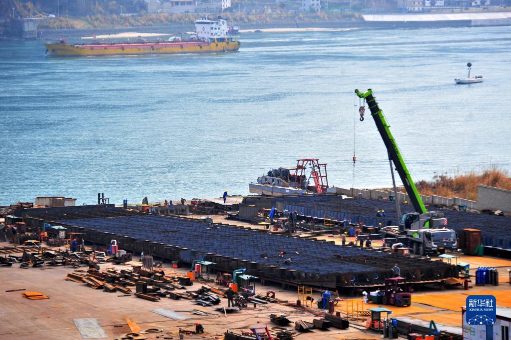 2月14日,湖北省宜昌市夷陵區樂天溪造船基地工人在加工制造大型貨船。
