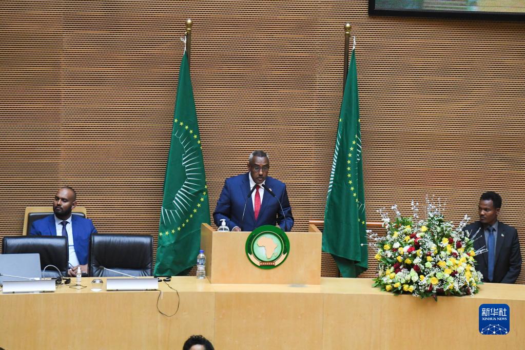 2月15日,在埃塞俄比亞亞的斯亞貝巴,埃塞俄比亞副總理兼外長德梅克(中)在非洲聯盟(非盟)執行理事會第42屆常務會議開幕式上發表講話。
