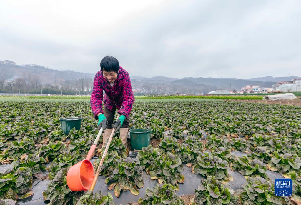 2月15日,村民在貴州省六盤水市鐘山區大河鎮大橋村蔬菜基地為蔬菜施肥。
