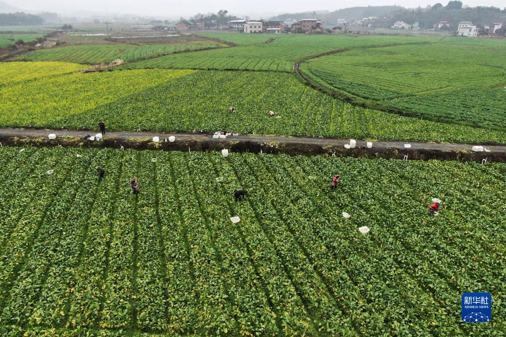 2月15日,在湖南省資興市回龍山瑤族鄉柏樹村蔬菜種植基地,農民在采收菜心(無人機照片)。