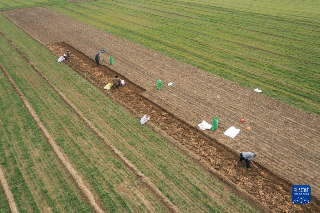 2月15日,河南省焦作市溫縣祥云鎮蘇莊村農民在田間采收懷地黃(無人機照片)。