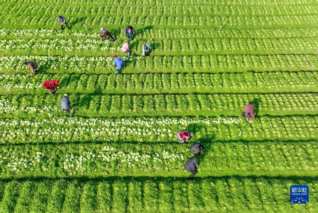 2月15日,農民在湖南省永州市道縣正禾農場蔬菜基地采收蔬菜(無人機照片)。