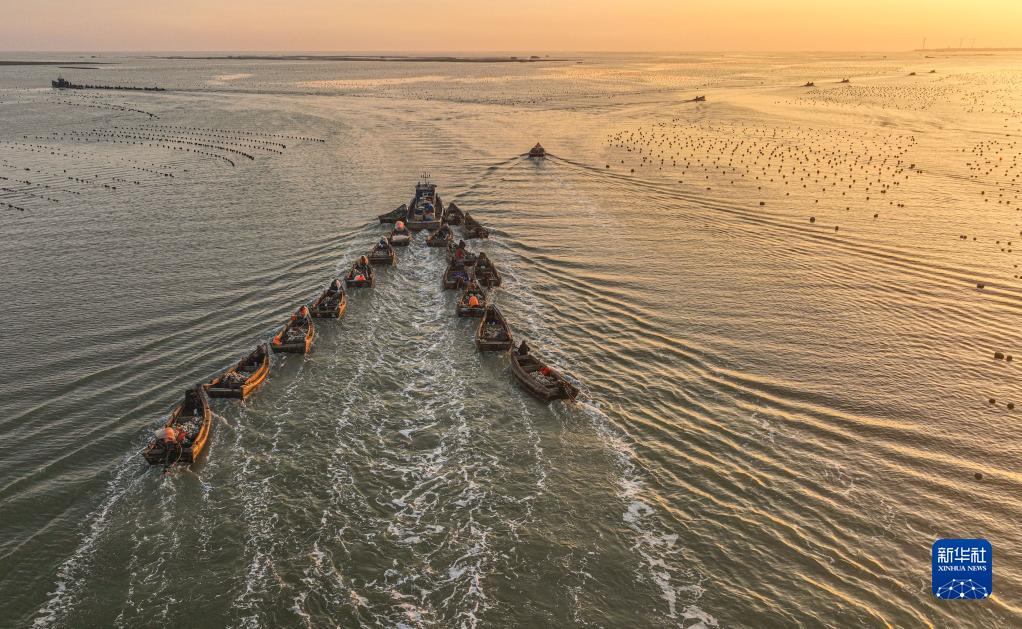 2月16日,在榮成市石島管理區桑溝灣海洋牧場網箱養殖區,漁民駕駛漁船出海作業(無人機照片)。