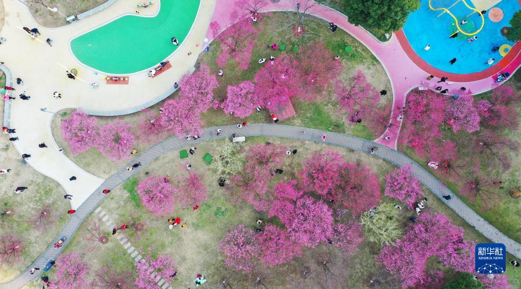 2月15日,安徽省合肥市蜀山區綠軸公園梅花盛開,眾多市民前來游玩賞花(無人機照片)。