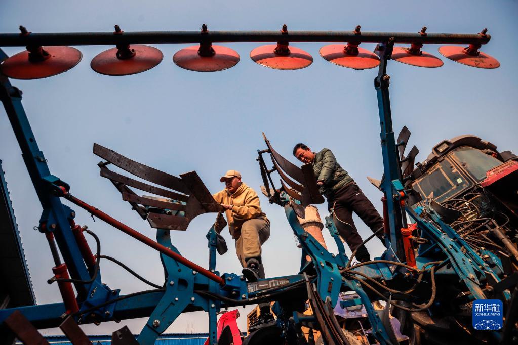 2月16日,農民在遵化市西留村鎮的一家農機服務專業合作社檢修旋耕機。