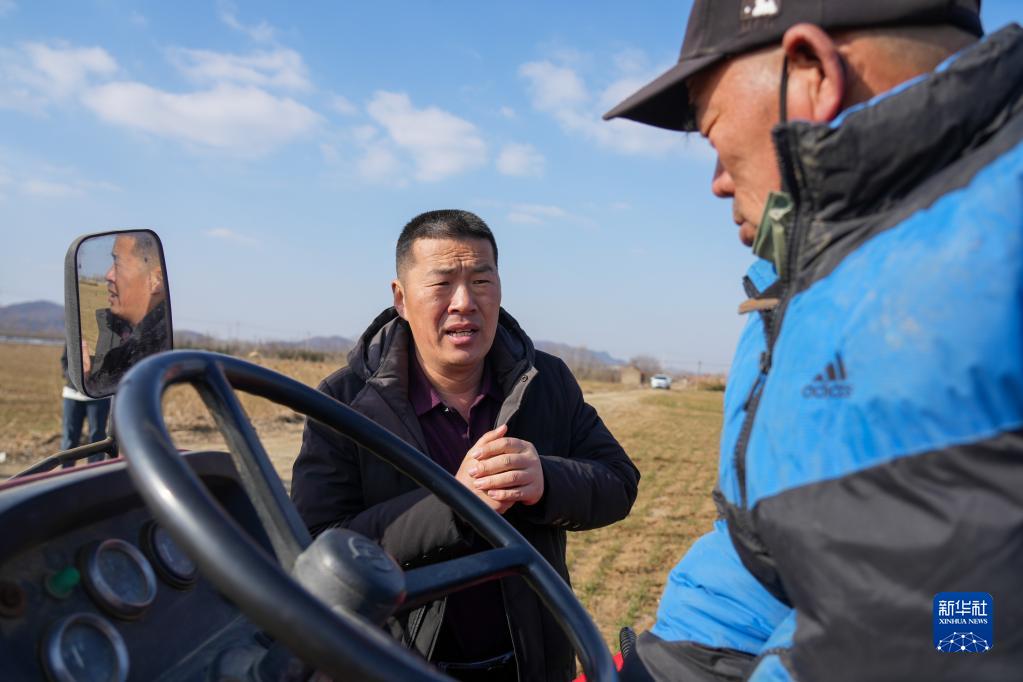 2月15日,山東省威海市文登區金農會農業專業合作社負責人于進海和農機手討論施肥方案。