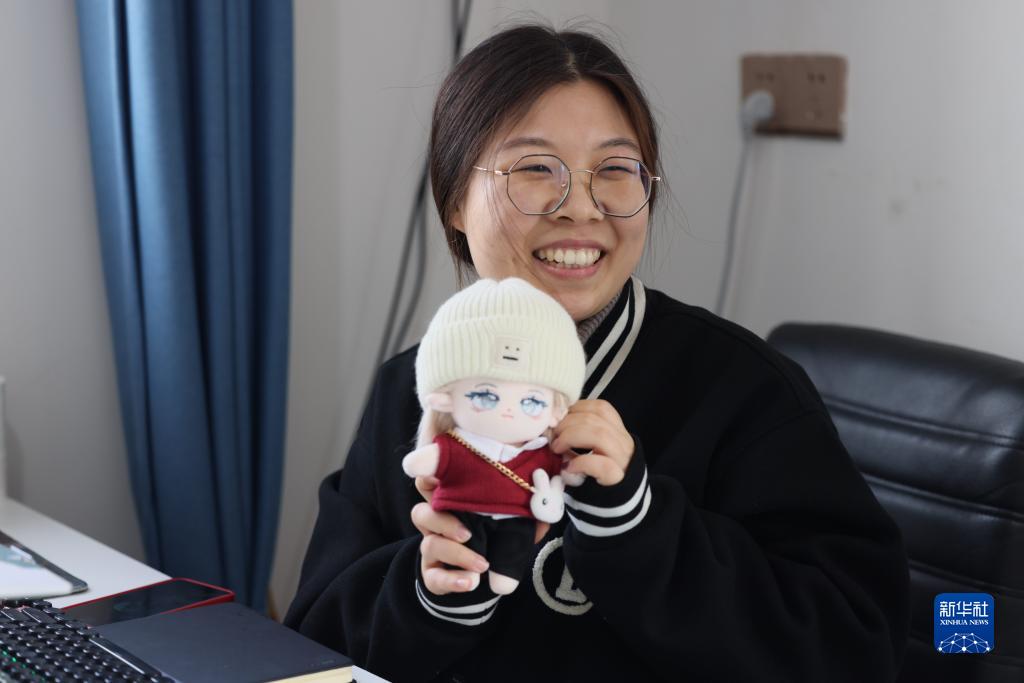 楊鑫博在項目部辦公室展示新購買的玩偶(2月15日攝)。